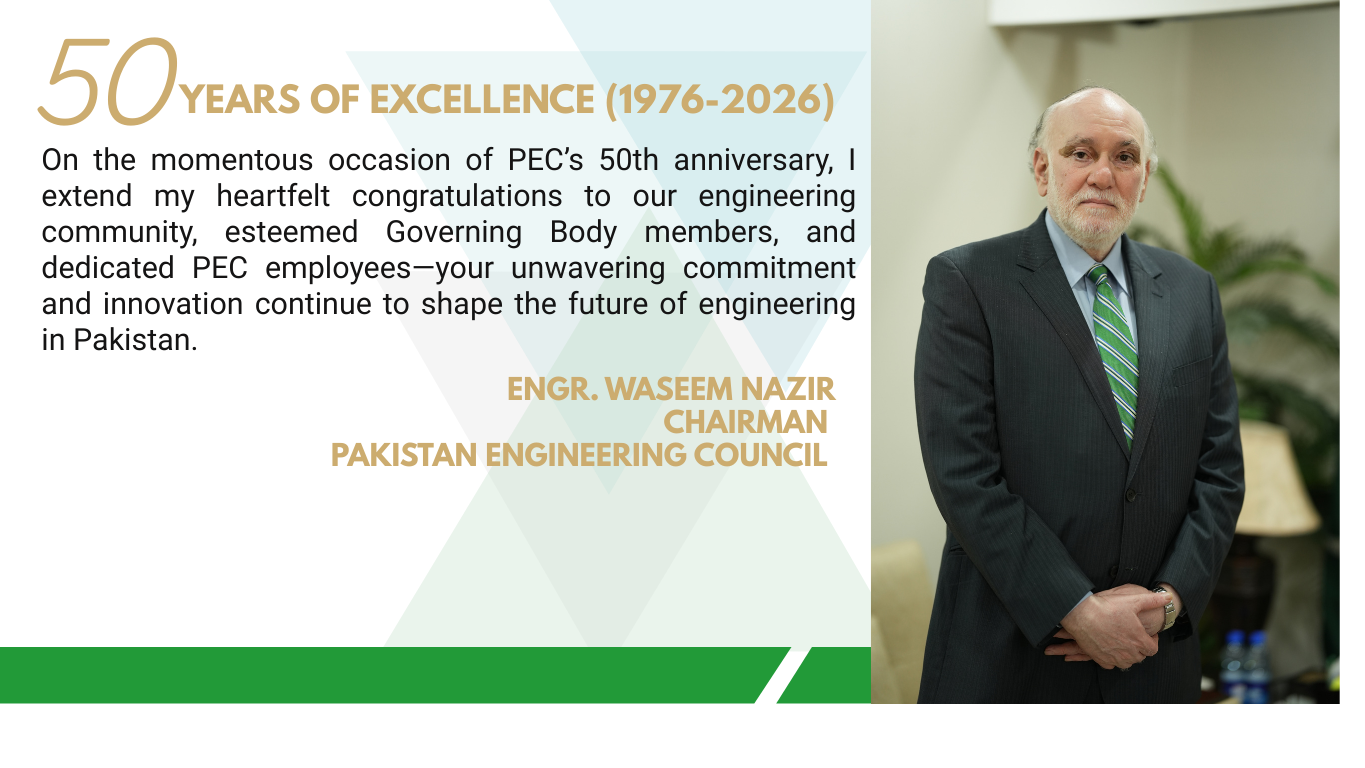 Engr. Waseem Nazir currently serves as the Chairman of Pakistan Engineering Council (PEC), having assumed leadership in 2024.