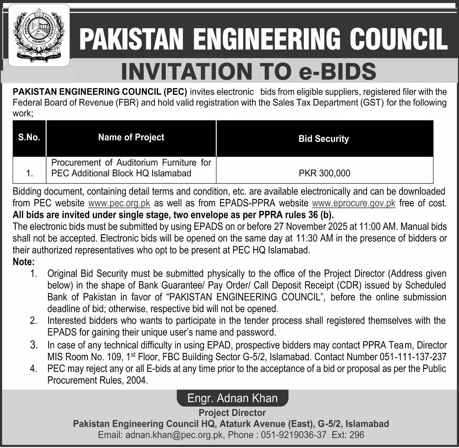 Invitation to Bid: Procurement of Auditorium Furniture – PEC Additional Block, HQ Islamabad Leave a Comment / NEWS & EVENTS / admin Invitation to Bid: Procurement of Auditorium Furniture – PEC Additional Block, HQ Islamabad Read More »